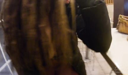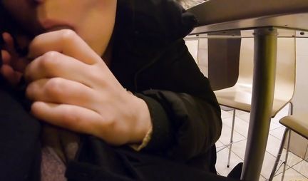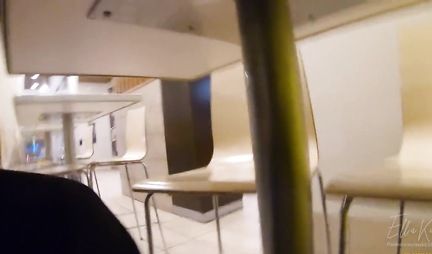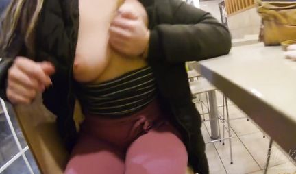 Девушка на публике показывает сиськи и делает минет другу под столом в кафе