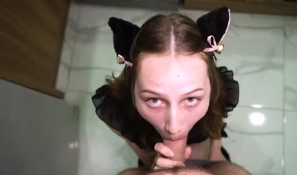 Молодая девушка с аккуратными сиськами сосет парню на кухне