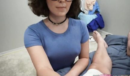 Подруга в очках ублажает член приятеля в домашней обстановке