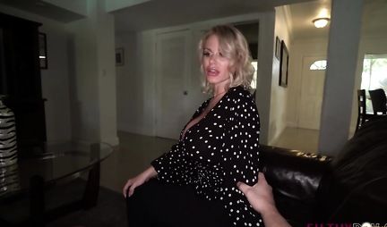 Ну вот если кто-то скажет на подросшего пасынка, что тот не помогает грудастой мачехе, тот нагло погрешит против истины, потому что молодой человек делает все возможное, чтобы блондинка-милфа получила кайф не только от дрочки двойным дилдаком, но и от его собственного крепкого члена. К слову трахаться пареньку нравится ничуть не меньше чем горячей бабенке.