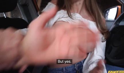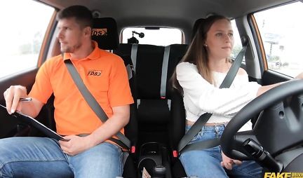 Развратная девушка в машине раздвигает ноги для секса с инструктором по вождению