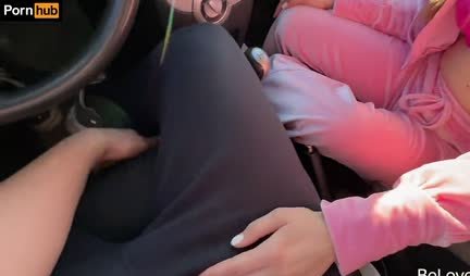Русская блондинка в ярком белье делает минет приятелю в машине