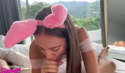 Сегодня симпатичная Сола Зола собиралась с другом в зоопарк, чтобы поесть мороженого и посмотреть зверушек. Но товарищ спит до обеда и даже шевелиться. Впрочем и самое девице определенно лень куда-то идти. Дабы сделать ход конем, она надевает заячьи ушки и начинает делать минет. Тот спросонья думает что уже в зоопарке и сполна наслаждается своими шалостями любимой находчивой подруги.