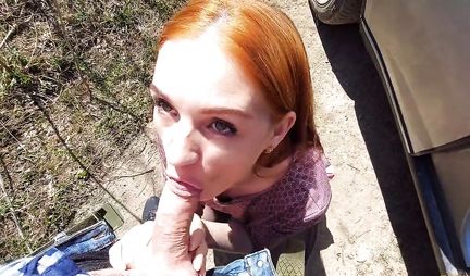 Русская рыжая девушка в машине делает минет в чулках и трахается на камеру
