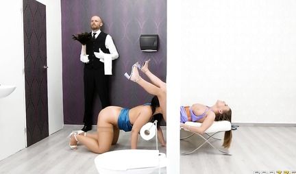 Жозефина Джексон и София Ли просто не могут оторваться друг от друга, занимаясь лесбийским сексом в туалете. Но все это ровно до тех пор, пока любовницы не замечают что стены туалетной комнаты имеют дырки. Скоро там появляется сантехник в лице испанского парня, который очень органично разбавляет лесбийский дуэт своим большим членом, вставляя его девушкам куда надо и не надо. Ну да красотки не в обиде, потому что так групповое порно лучше в разы.